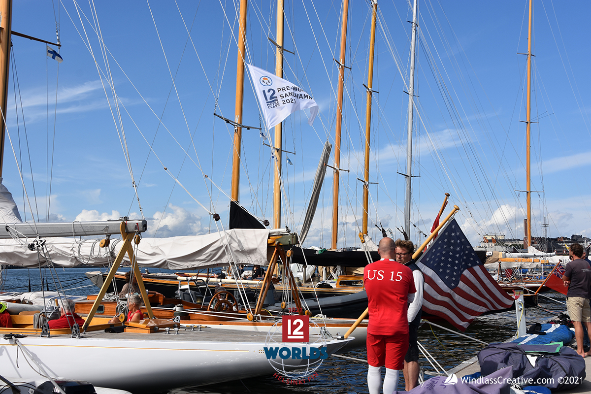 Although sailed by a Danish-German crew, Vim (US-15) flies the US flag in honor of her original sail number here on the dock at NJK for the 2021 EVLI 12mR World Championship ~ photo: SallyAnne Santos