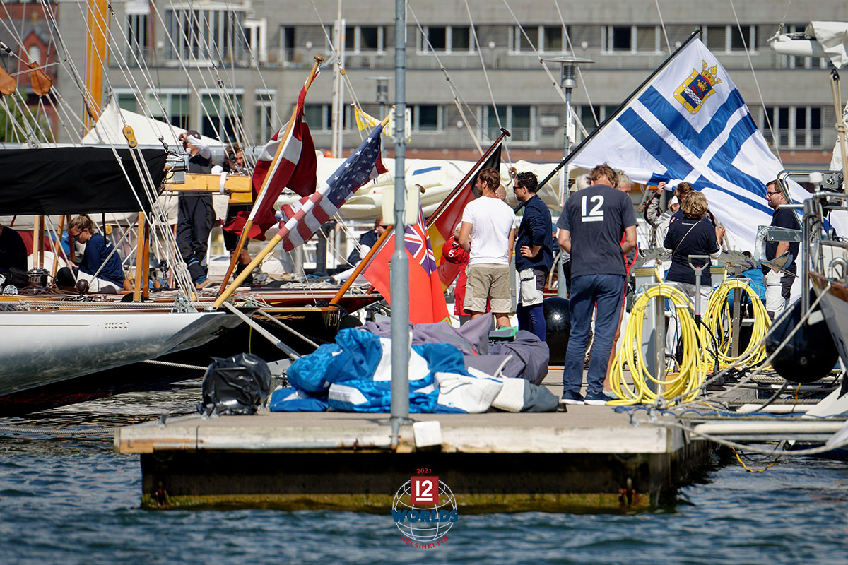 A sea of flags on the NJK dock at the 2021 EVLI 12mR World Championship, photo: Sailpix.fi